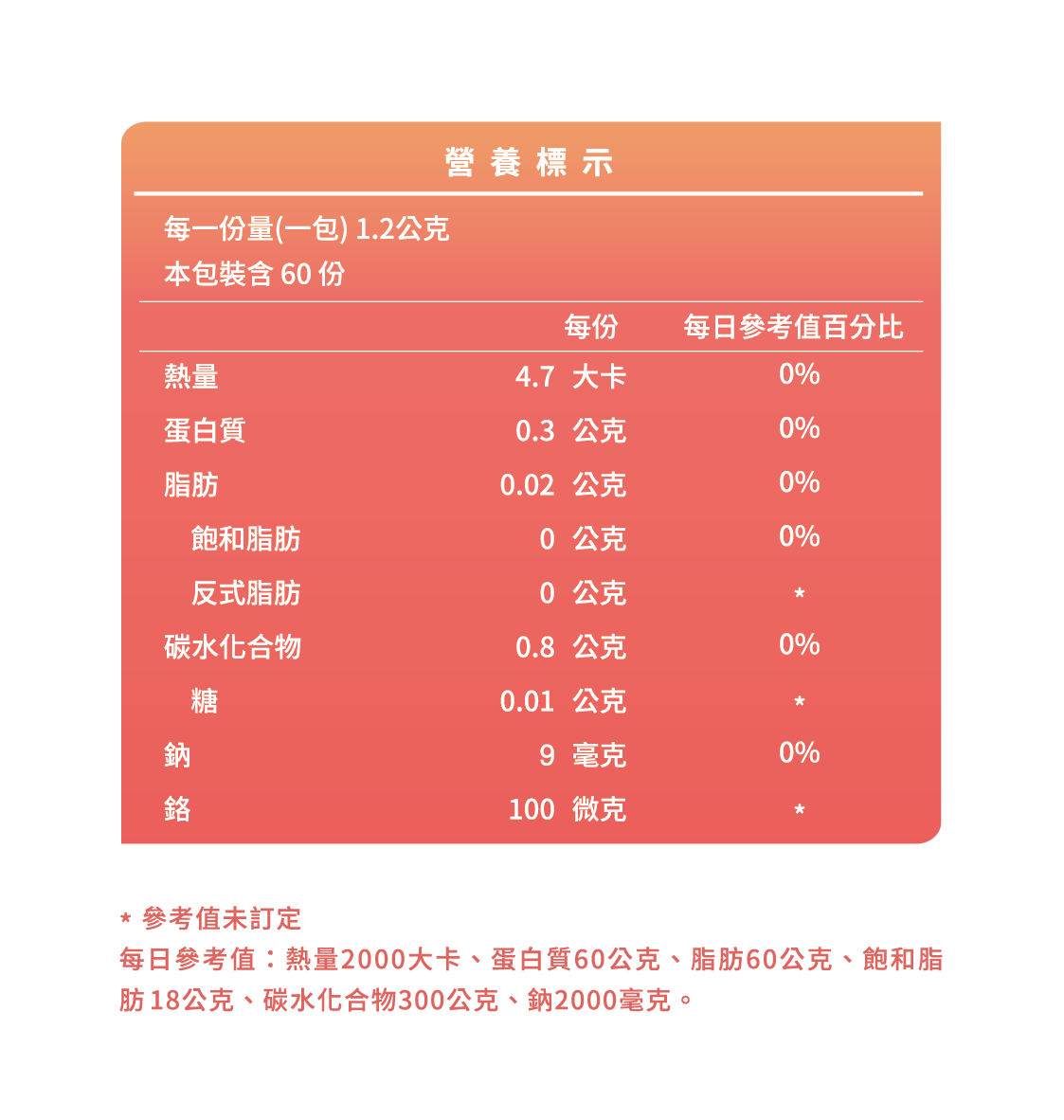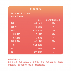 *內容物:D-山梨醇(甜味劑)、燕麥粉、分離乳清蛋白、阿拉伯糖、食鹽、三氯化鉻、維生素E(維生素E、麥芽糊精、辛烯基丁二酸鈉澱粉、二氧化矽)。